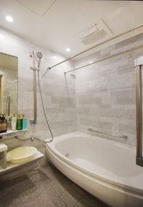 手洗いボウル周りの水ハネ対策や空間全体の清掃性を高めるために壁にパネルを施工しました。お掃除しやすくなっただけではなく、石目調のパネルで落ち着いた雰囲気に仕上がっています。
